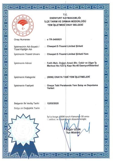 Cheepet Supplement & Accessories markamız, evcil hayvanlara yönelik takviye edici yem ürünlerinin satış ve depolama faaliyetlerini yürütmek üzere, Tarım ve Orman Bakanlığı tarafından verilen Yem İşletmesi Onay Belgesine sahiptir. İlgili kanun ve mevzuatlar kapsamında, ev ve süs hayvanlarına yönelik yemlerin güvenli, izlenebilir ve mevzuata uygun şekilde ticaretinin yapılabilmesi için gerekli yasal onayın alındığını göstermektedir. Cheepet olarak, ürünlerimizin kalitesi kadar yasal güvenilirliğine de önem veriyor; şeffaflık ilkemiz gereği, sahip olduğumuz tüm belgeleri kamuoyuyla paylaşmayı bir sorumluluk kabul ediyoruz.